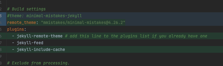 내가 원하는 테마를 지정해주고, plugin에도 remote theme, jekeyll-include-cache를 추가해줬다.
