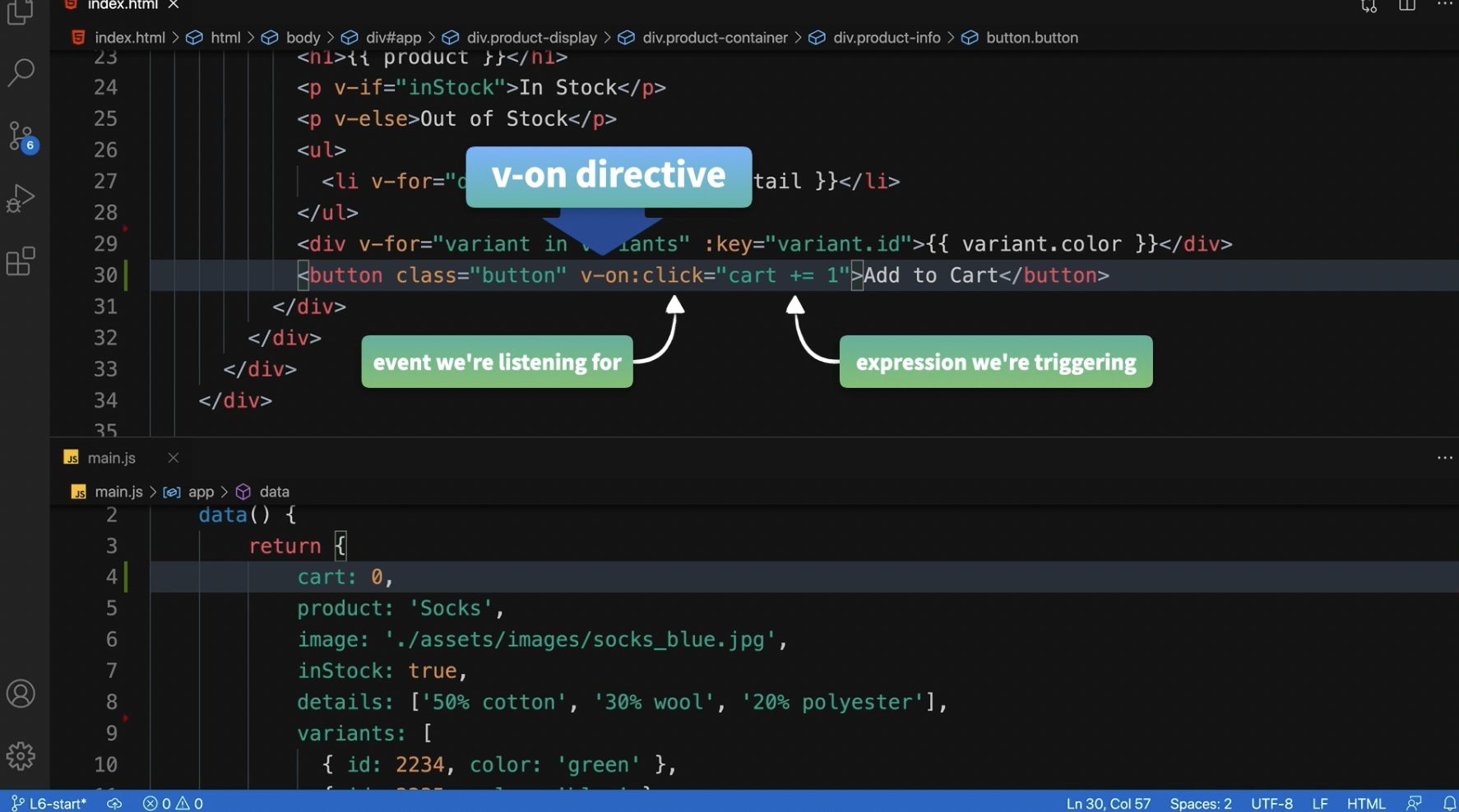 v-on:click="addToCart"
