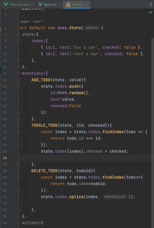 Mutations안에 작성한 함수안에서 state를 접근해 데이터 변경 실행.