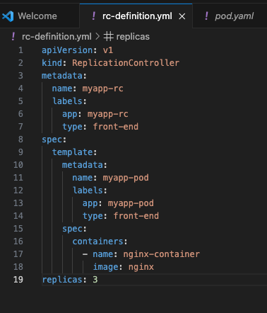 Replication Contollers : to run multiple instances of a single pot in a Kubernetes cluster, thus providing high availability. 하나의 pod만 실행 시에는 필요 없을까? nope, 만약 작동 중인 pod에 문제가 생겼거나 꺼지는 경우 replication controller를 사용하면 자동으로 새로운 pod를 생성, 실행시켜 줌. 항상 정해진 개수의 pod가 실행될 것이라는 것을 보장받을 수 있다.
