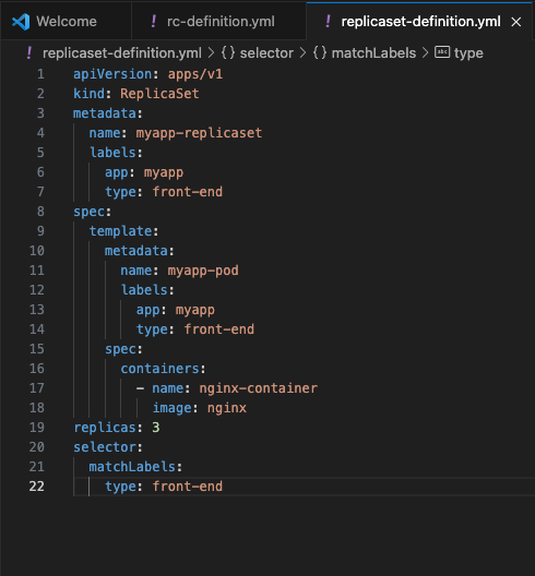 - 생성된 pod가 많을 경우, Label에 설정해 둔 내용을 토대로 replicaSet의 selector section에 동일하게 작성해 줄 경우 (예를 들어, Pod Label에 'tier: front-end'라고 작성했을 경우 replicaSet의 selector 아래에도 똑같이 'tier: front-end'라고 작성하여 사용) 해당 pod들을 감시 및 replicas 개수에 맞게 계속 실행될 수 있도록 조정해 준다.